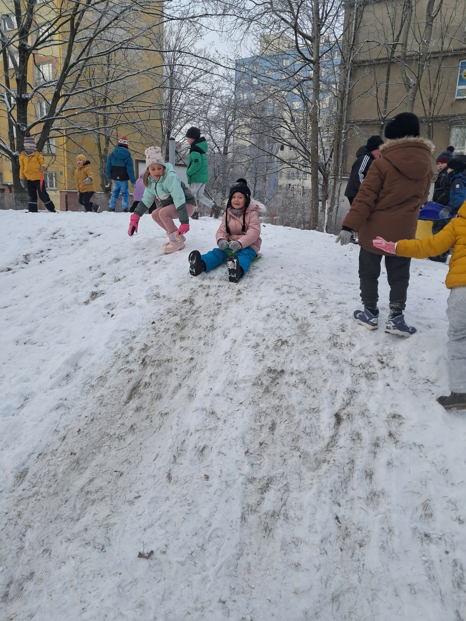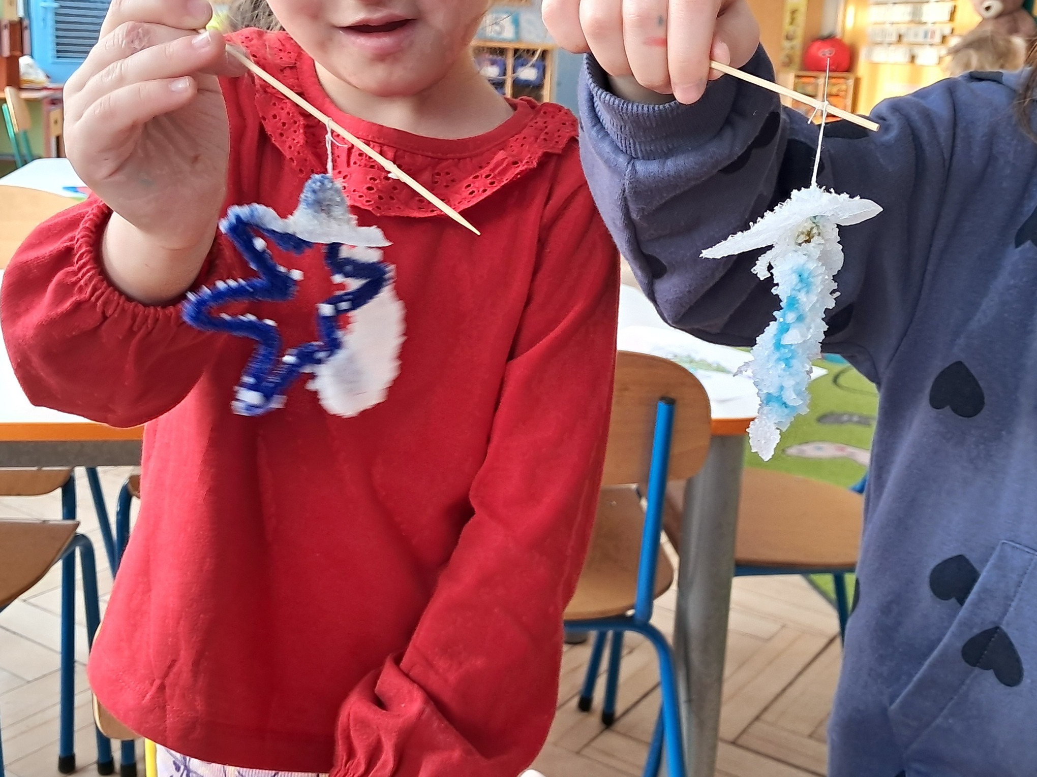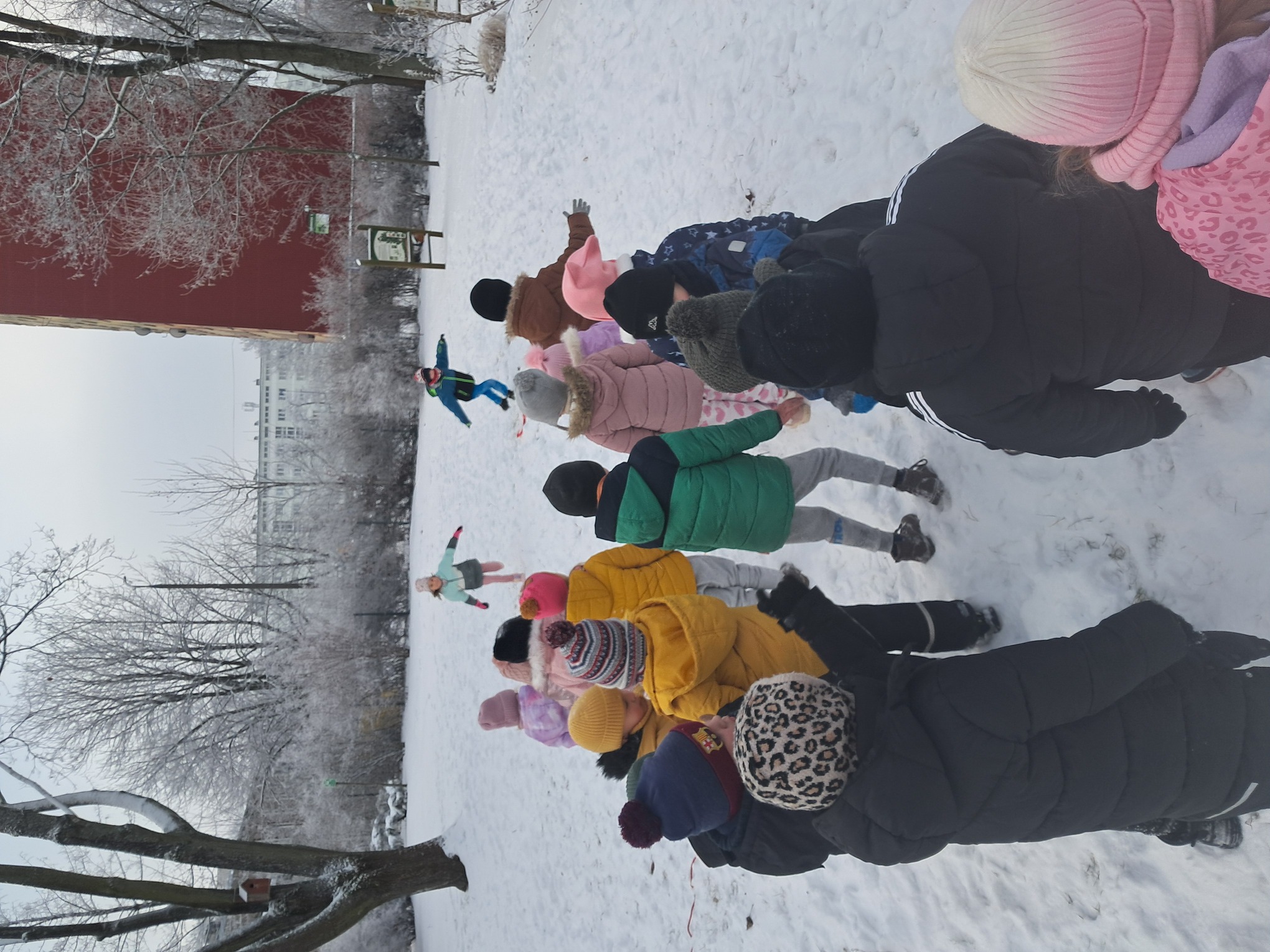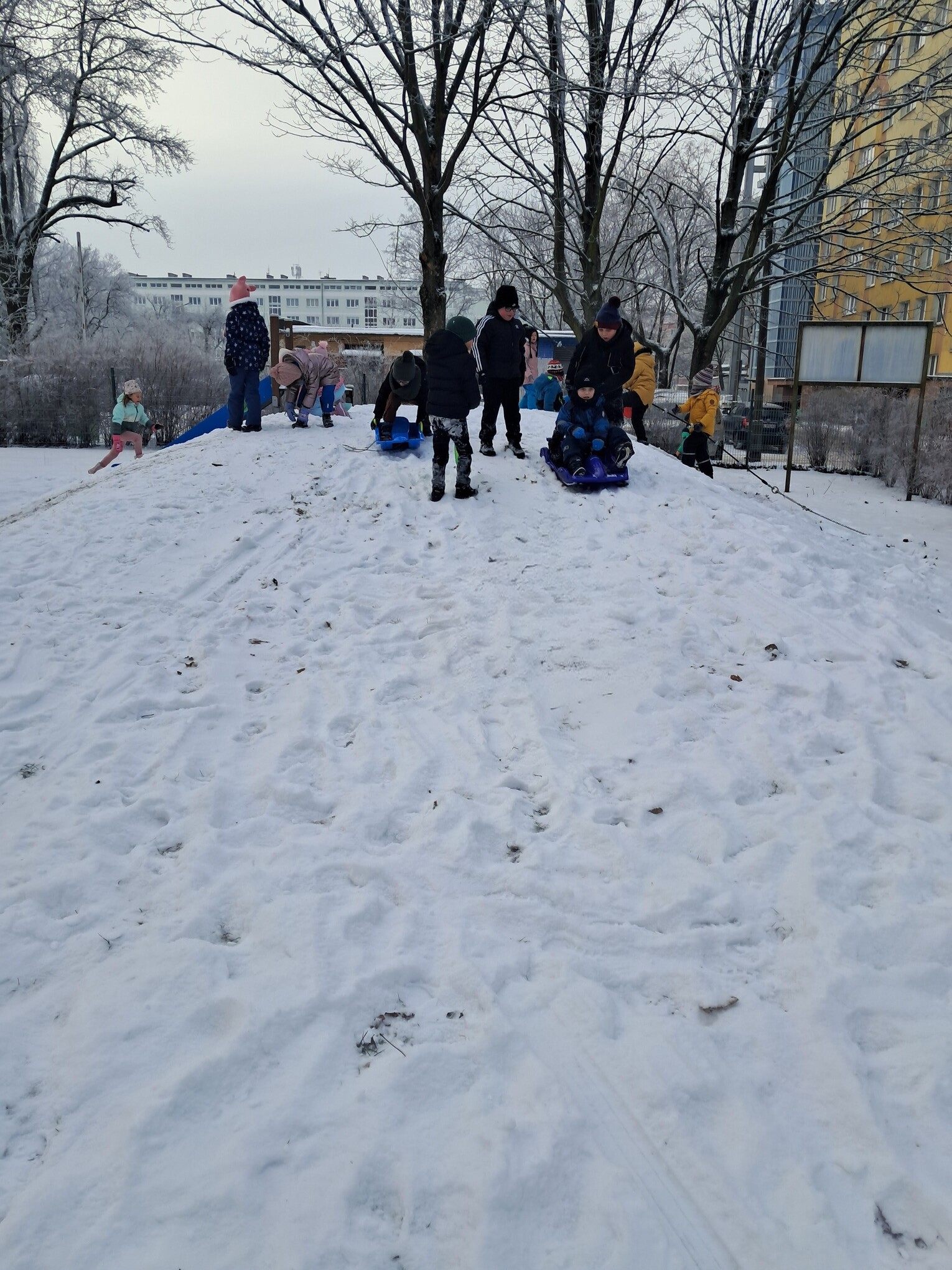 W naszym przedszkolu dzieci korzystają z pięknej, zimowej pogody. Mamy czas na zimowe zawody, więc próbujemy "jeździć" jak na nartach, a na "łyżwach" wykonujemy piruety. Rzucamy śnieżkami i bawimy się w zamrożone lodowe figury. Najwięcej frajdy daje nam jednak zjeżdżanie na sankach i jabłuszkach. Gdy na dworze zimno, po powrocie do przedszkola czeka nas cieplutki sok malinowy, a potem pyszny obiad. Panie nauczycielki prowadza dla nas wiele ciekawych zabaw, zajęć i zimowych eksperymentów. Razem z panią przeprowadziliśmy tez eksperyment, w którym kryształki soli tworzące się w słoiku z roztworem solnym, otoczyły puchowe gwiazdki niczym kryształki lodu.